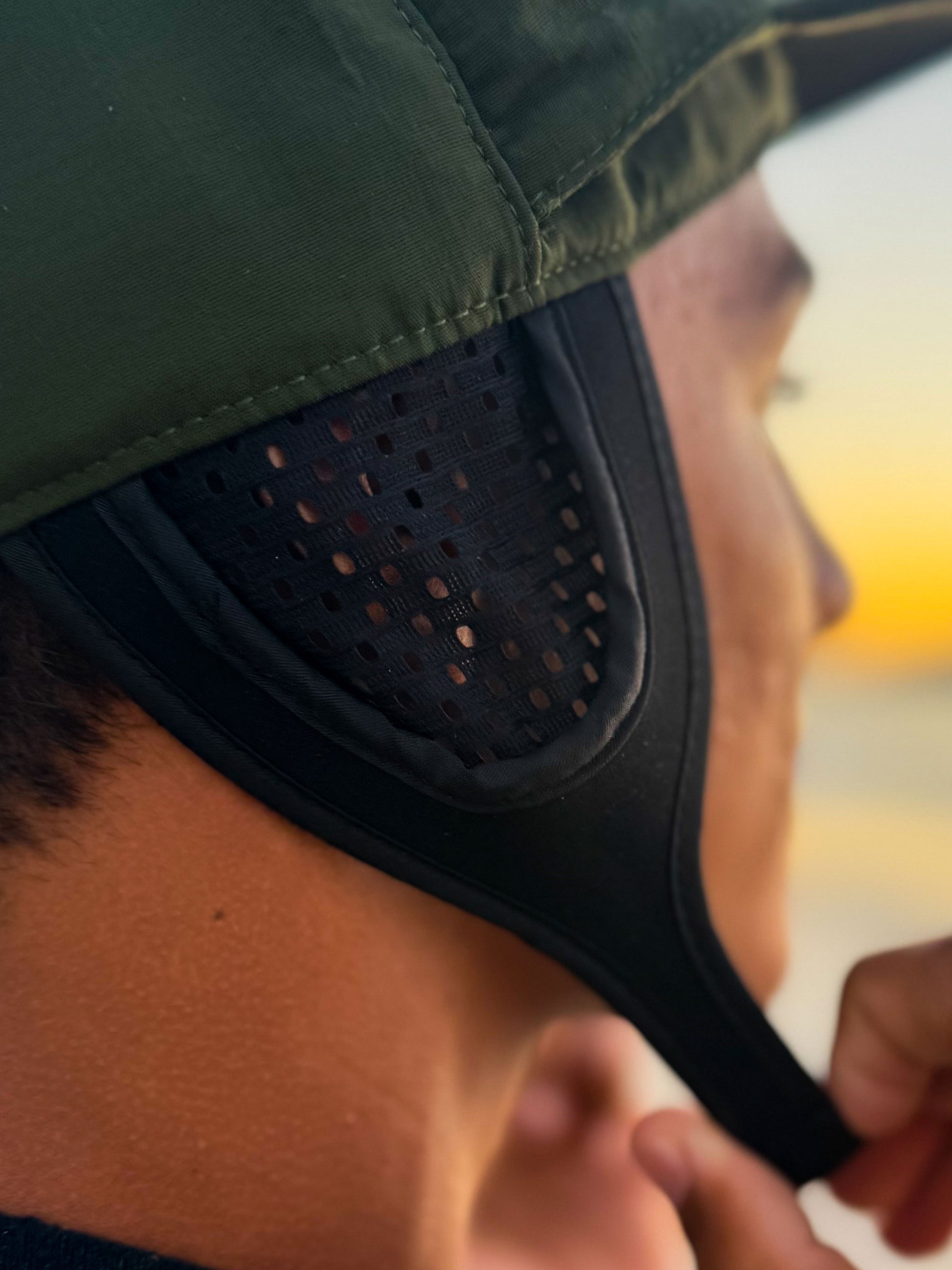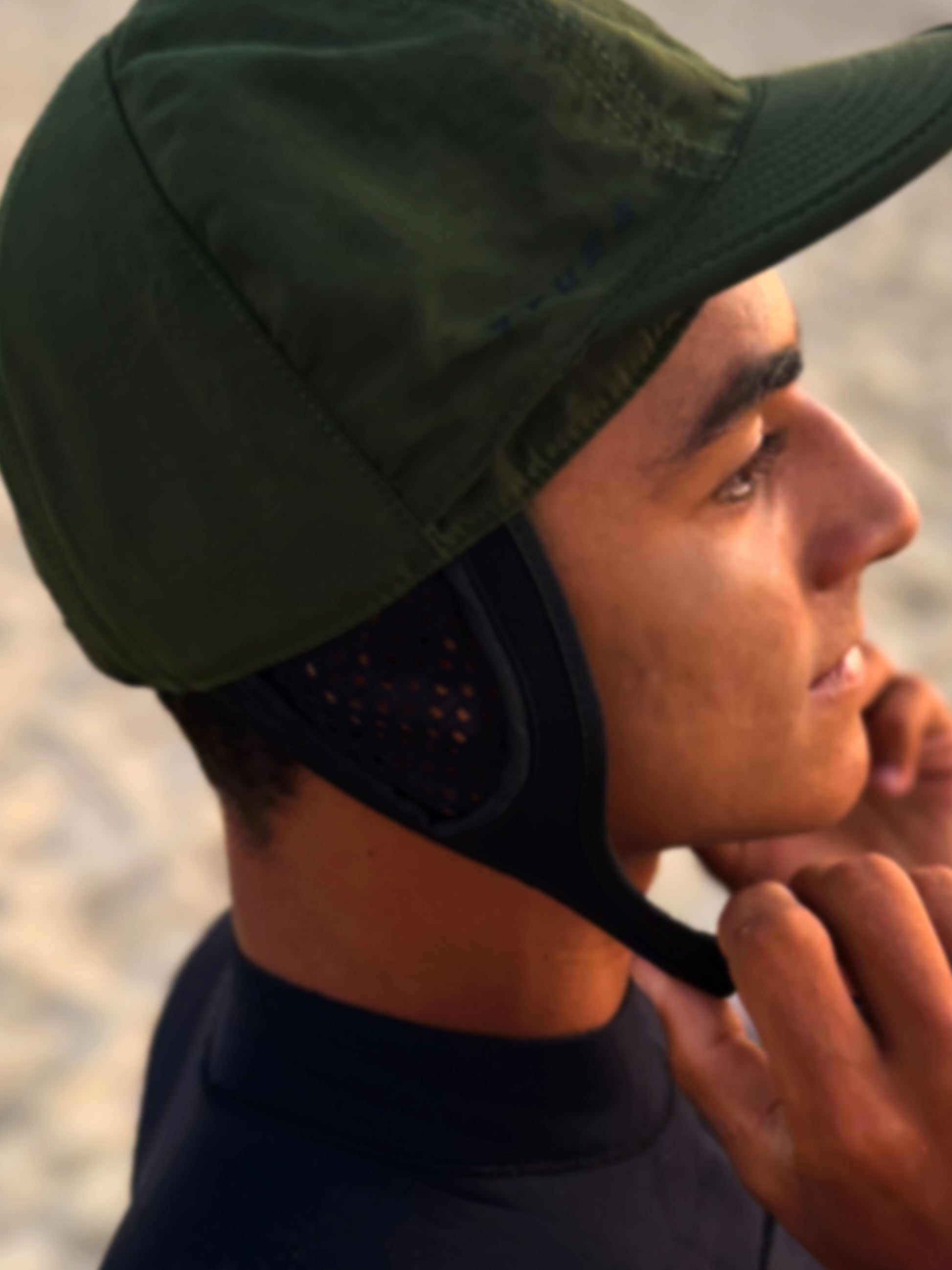 Ele conta com uma aba que se ajusta automaticamente ao fluxo da água, sendo empurrada para trás pela onda na hora do joelinho, evitando que o boné se desloque na cabeça.